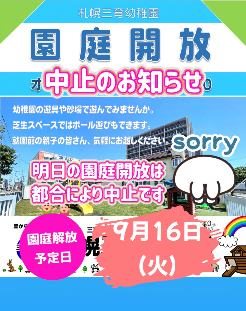 明日、9月16日の園庭開放は、園都合によりお休みとさせていたできます。